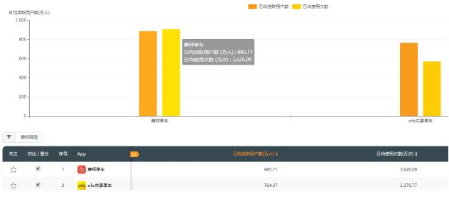 另外,摩拜单车9月月使用次数达到10.9亿次,ofo小黄车为6.8亿次,摩拜领先超4亿次,领先幅度达60%;日均使用次数达到3626万次,ofo小黄车为2280万次,摩拜领先超1300万次,领先幅度达59%;摩拜9月人均单日使用次数达到4.09次,ofo小黄车为2.98次,摩拜领先超1次,领先幅度达37%。