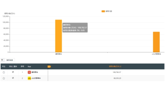 QuestMobile数据显示,9月份,摩拜APP的总使用次数高达10.9亿次,ofo则为6.8亿次,摩拜单车遥遥领先,是ofo的1.6倍。摩拜单车9月份APP日均使用次数方面,摩拜单车为3626万次,ofo则为2280万次,摩拜领先幅度达59%。
