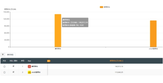 在使用时长方面,QuestMobile的数据显示,今年9月,摩拜单车用户的总使用时间长达14.1亿分钟,而ofo用户为11.4亿分钟;摩拜领先超3亿分钟,领先幅度达24%。APP使用时长是衡量用户粘性的重要指标,该项数据也表明,摩拜单车用户粘性领先ofo处于行业第一位置。