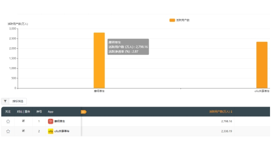 9月摩拜单车日均活跃用户量达886万,领先于ofo的764万,领先幅度达16%。10月份摩拜继续保持领先势头:10月第一周,摩拜单车的周活跃用户量达2798万,而ofo为2336万;摩拜领先超450万人,领先幅度达20%,与9月份相比有所扩大。