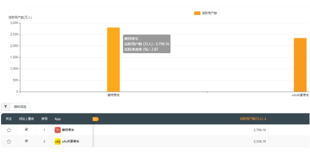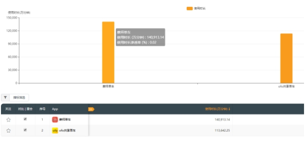 另外,今年9月摩拜单车APP的总使用次数达10.9亿次,ofo则为6.8亿次,摩拜单车的领先幅度约为60%;摩拜单车用户的总使用时间长达14.1亿分钟,而ofo用户为11.4亿分钟,摩拜领先超3亿分钟,领先幅度达24%。