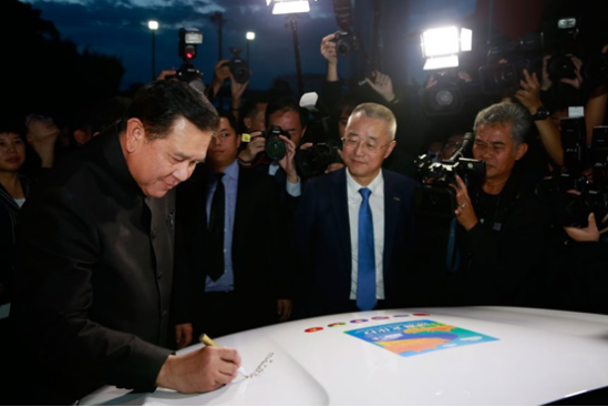 最值得一提的是,当“博越·热爱”四国文化之旅车队抵达曼谷时,泰方为车队举行了隆重的欢迎仪式。在仪式上,泰国副总理塔纳萨在讲话中对“中国制造”的代表作—吉利博越表示极大的肯定,并在博越车身上签名,附上对中泰两国友谊的祝愿:中泰友谊万古长青!
