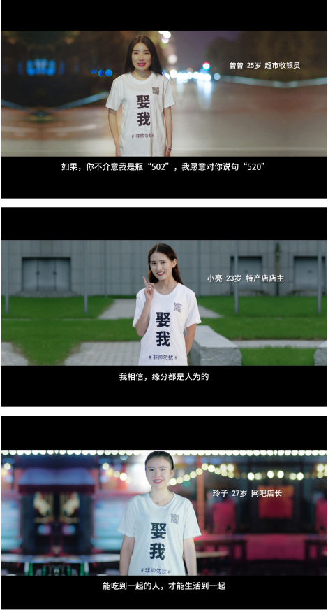 本次发布的三则“代颜人”故事中,有因为距离错失过友情,所以在爱情里希望不再有距离;有曾经吃过很多苦,希望和喜欢的人一起,把“苦”吃成“甜”;还有喜欢就要去追的,绝不让自己留遗憾。对此,官方表示这仅是百名“代颜人”的缩影,也是为11月11日举办千人脱单派对造势,为帮她们找到三观五官都正的帅哥一起脱单。