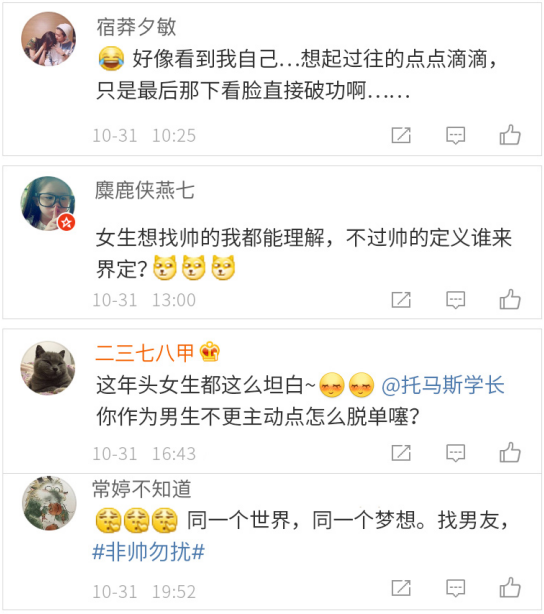 倾情告白恋爱心声后,单强调#非帅勿扰#的择偶要求,引发不少网友纷纷说出自己的恋爱经历和择偶观,也有网友转发给身边单身朋友拉着一起评论: