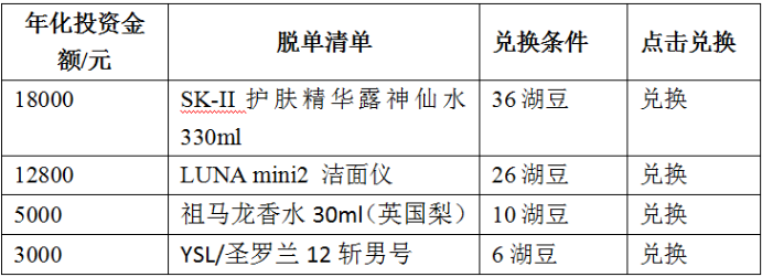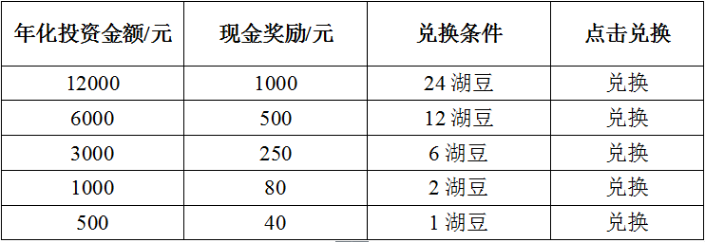特别需要提醒所有参活动的用户,请务必在活动期间内进行兑换,逾期无效。同时,双十一理财活动奖励不与平台内其他渠道活动同享,其他渠道活动已获得的投资奖励不能累计到本次活动中来。当满足所有条件且湖豆数量达到要求时,用户点击兑换即可进行兑换。