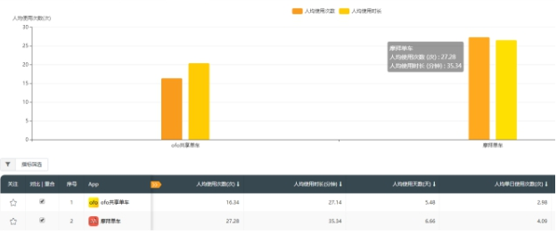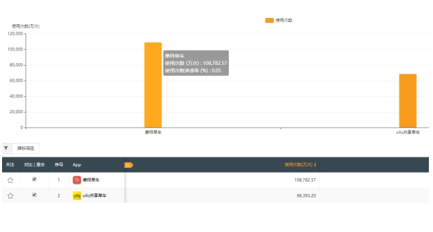 在使用次数方面,今年9月,摩拜单车APP的总使用次数达10.9亿次,ofo则为6.8亿次,摩拜单车的领先幅度约为60%;APP日均使用次数方面,摩拜单车为3626万次,ofo则为2280万次,摩拜领先幅度达59%。