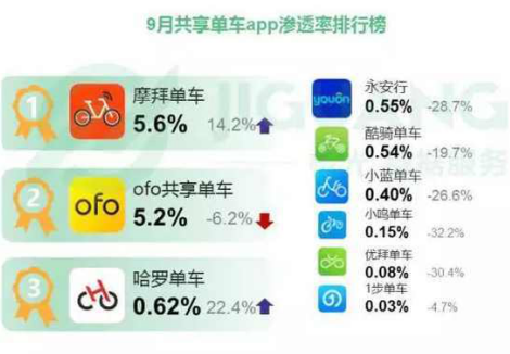 另据极光大数据显示,2017年Q3移动互联网行业摩拜单车以渗透率5.6%高居榜首,环比上升14.2%,保持高增长,ofo共享单车渗透率为5.2%,环比下降6.2%。