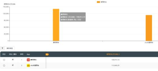 在APP使用时长数据中,摩拜9月份使用时长共计14.1亿分钟,ofo则为11.4亿分钟,摩拜领先超3亿分钟,领先幅度达24%。而在人均使用时长方面,摩拜9月份人均使用35.34分钟,ofo人均使用27.14分钟,摩拜领先超8分钟,领先幅度达30%。