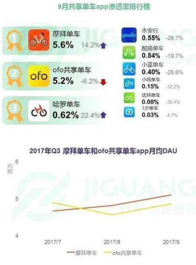 在9月的日均活跃量用户方面,摩拜日均为886万,ofo则为764万,其中摩拜领先超120万,领先幅度达16%。