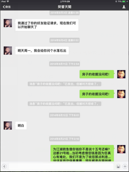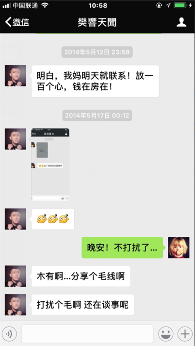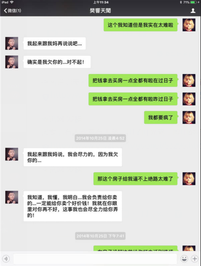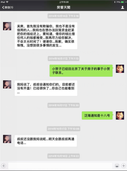 (2014年案发时樊响天闻在微信中对吴爽的虚假承诺)