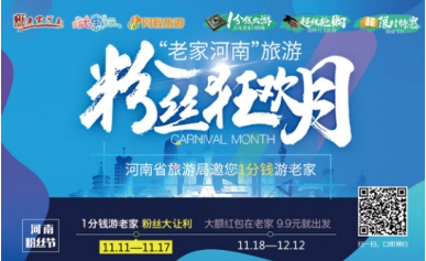 为拉动河南旅游淡季市场,打造旅游惠民平台,河南省旅游局顺应时下互联网经济消费特点,结合网络“双十一”、“双十二”全民购物节,联合同程旅游,于11月11日-12月12日期间重磅推出“老家河南旅游粉丝狂欢月”活动。