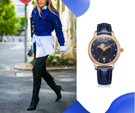 这款GK1060L玫瑰金腕表,风格华丽多姿,月相功能神秘变幻,减龄效果十足。它的璀璨和华美,能缓和深色带来的压抑,也能为厚重的着重增添活力,让女性在冬日的户外不用“下衣失踪”,也能保持时尚的风度。