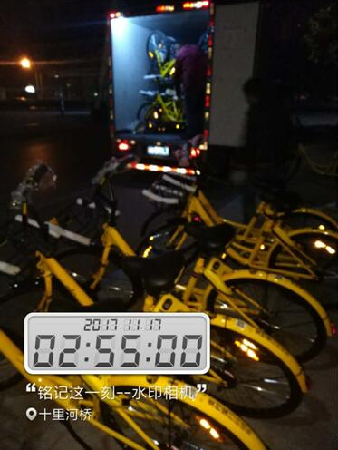 从网友拍摄的照片、视频可以看到,11月17日凌晨2点55分,在北京市朝阳区十里河桥附近,两位疑似ofo工作人员从厢货车上匆匆忙忙的搬运、投放小黄车。尽管是深夜,可因为现场灯光条件较好,可以明显看到,这些刚投放的小黄车崭新锃亮,是新车无疑。