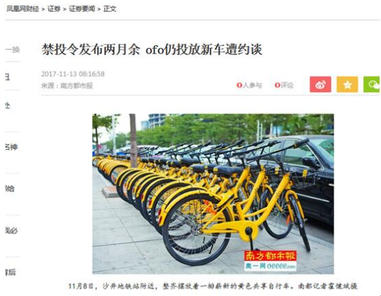 从媒体报道信息中可以看到,ofo曾因违反禁投令投放新车而被相关部门约谈,而深圳市交委曾对外称,个别企业存在以更新车辆名义进行新车投放,目前为止,深圳市交委和城管部门分别发现并确认了1起ofo违规投放新车的情况。