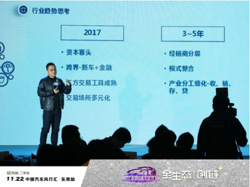 东莞二手车行业协会会长王敏在盛典当日同所有同行分享东莞二手车行业的发展态势——中国汽车市场从2002年第一次井喷后,发展至今已到一个相对较成熟的阶段,随着二手车市场的不被被唤醒,中国二手车市场发展前景十分广阔,到2020年中国的二手车市场规模将突破万亿。而二手车行业的发展,本质上是数据匹配。数据是二手车行业的底层,服务的核心是完成消费者、车、车商三者之间的数据匹配。因此,在新的市场机遇下,谁主动完成同互联网的深度融合,高效地完成数据匹配,谁就是这个行业里发展的引领者。58平台提供的服务板块非常扎实,面对庞大的二手车市场,这对于车企和58同城二手车平台的合作而言,是万亿的市场份额同满足需求的车源与流量的联合携手,相信会为行业发展带来全新动力与生机。