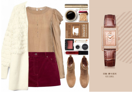 毛绒的外套与花边的丝绒长袖,兼具女孩的可爱和女人的妩媚,十分甜美。玫瑰金色的银表GS1181L典雅别致,将这身穿搭衬托得更显温柔,回应现代女性对美丽与独立的向往。