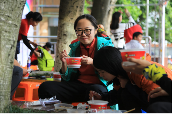 图:参加公益徒步的选手现场吃到真功夫营养热饭