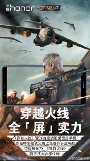 除了拥有丰富的配色之外,荣耀畅玩7X的内在配置也十分强劲。屏幕上,搭载了时下极为流行的全面屏技术,5.93英寸18:9显示比例,无论是手游爱好者还是追剧小迷妹,都能更直观的体验到全面屏带来的震撼视觉感受。目前荣耀畅玩7X已经完全适配《穿越火线》游戏,从软件、硬件方面做深度结合,实现游戏整体的UI界面完美适配荣耀畅玩7X的18:9比例屏幕,方便玩家在枪战对局中获得更大的视角,抢占制胜先机。