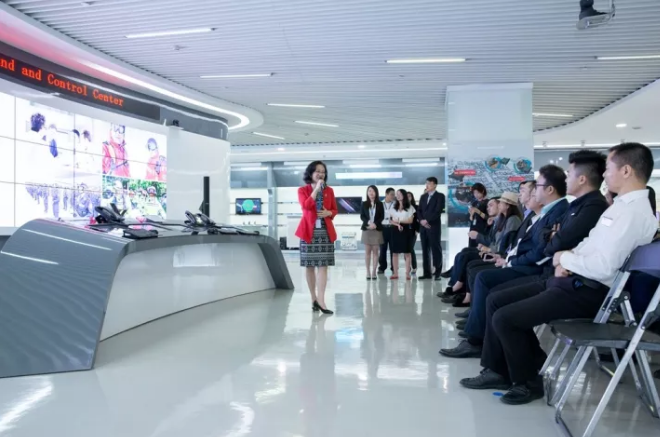 在海能达全球总部展厅,“一带一路”参观团被眼前一块硕大的弧面显示屏所吸引。这个名为“应急联动指挥调度中心”的可视化指挥系统,被讲解员冠以“千里眼”、“大喇叭”和“大脑袋”三个形象的称谓。所谓“千里眼”,是指它的远距离可视化“特异功能”,当有警情发生时,接警员可以在屏幕上看到报警人的位置,通过摄像头了解案发周围的情况,还能看到案发现场附近有哪些可调度的资源。“大脑袋”的特点在于快速分析现场警情,最短时间了解警力部署情况及案件频发的地方,这有利于更好地规划部署警力。有了“千里眼”和“大脑袋”的鼎力相助,“大喇叭”的功能才得以充分发挥,坐镇指挥中心的警局领导可以直接调度一线警力,从容应对现场突发情况。