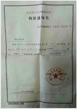 两天之后,神山居委会治保委员将一张写有汕头市公安局潮南分局的拘留通知书丢在了郑女士家门口,连声招呼都没打就走了。