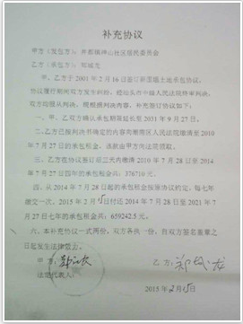 根据汕头市中级人民法院的判决结果,神山居委会和郑城龙于2015年2月15日签定了延长承包期限的“补充协议”。
