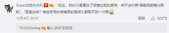 而对于微博没有任何“屏蔽或做曝光限制”的声明,也有不少用户反驳。用户”Super滚筒洗衣机“表示,有些账号的动态真得很久都刷不到一次。”丨阿丨布丨“也表达的类似的观点,自己经常刷无可刷的时候还会出现五天前的内容。