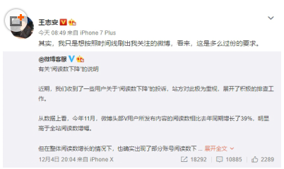 对于“微博限流,阅读数下降”的诸多吐槽。微博客服12月4日回复称,只是更改了微博出现的顺序,并不会对其“屏蔽或做曝光限制”。然而这条微博引发了更多的抗议和讨论,不乏王志安这样的知名大V。“微博该不该替用户选择看到什么”,成为争议的焦点。