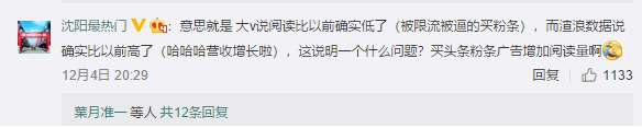 但事实上,很多大V并不认可。甚至有博主调侃,”大v说阅读比以前确实低了(被限流被逼的买粉条),而新浪数据说确实比以前高了(营收增长),这说明一个什么问题?买头条粉条广告增加阅读量啊!“