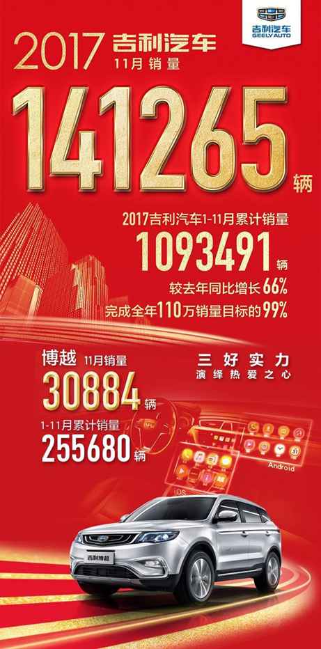 真正中国式的节目创新可以大大提高收视率,真正中国风设计的车型也更容易受到中国年轻人的喜爱。被誉为“大美中国SUV”的吉利博越,将中国传统文化元素与国际审美潮流完美融合,加之领先同级的卓越产品力,未上市先成“网红”,上市后销量一路飘红,11月博越销量再破3万达30,884辆,同比增长67.8%,创上市以来销量新高,1-11月累计销量255,680辆,连续12个月销量超过2万辆,不断刷新的销量记录,彰显出博越强劲的发展势头。