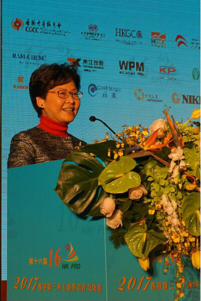 【香港商报讯】记者李珏报道:由香港工业总会、香港生产力促进局、珠三角工业协会主办的“2017年第十六届香港珠三角工商界合作交流会”日前假东莞康帝酒店举行。香港特别行政区行政长官林郑月娥,广东省政府领导陈云贤,东莞市委书记、市人大常委会主任吕业升,东莞市委副书记、市长梁维东、中联办经济部副部长兼贸易处负责人刘亚军、香港工业总会主席郭振华,香港生产力促进局主席林宣武,香港工业总会副主席、珠三角工业协会主席叶中贤等人莅临主礼。活动在郭振华、林宣武、叶中贤的欢迎辞中拉开序幕,现场逾千人见证是次交流会,气氛热烈。