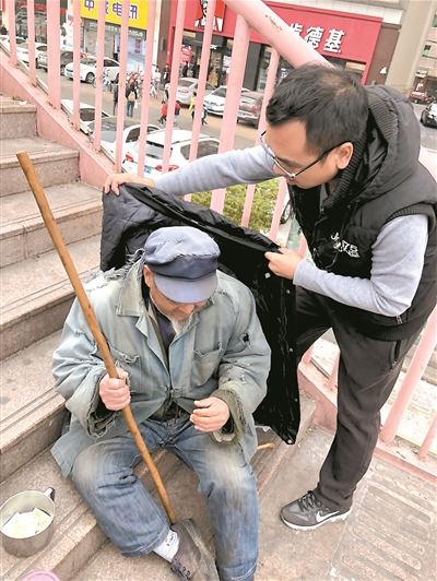 经询问,他姓陈,今年50多岁,由于一直未婚,离乡别井,到处打散工,而现在年老多病,因而流浪街头,但他表示不愿意到救助站接受政府的救济,也不愿意回家,他看到工作人员为他送来棉衣和泡面,连声说感谢。