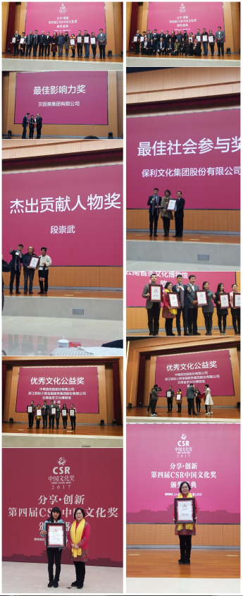 2017年12月20日,由人民日报社《国家人文历史》杂志社主办的以“分享•创新”为主题的2017年度第四届“CSR中国文化奖”颁奖盛典在北京成功举办。活动共选出了八个奖项,涵盖了从社会公益参与到传媒责任等多个领域。