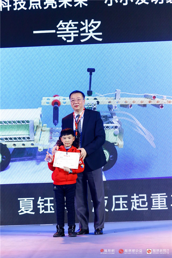 图:马旭与“小小发明家”第一名获奖者夏钰洋合影