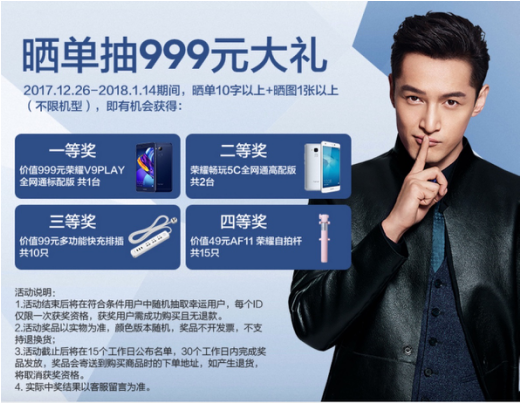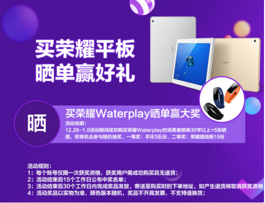 又是一年“跨年扫货节”!防水影音平板荣耀Waterplay延续双旦礼遇感恩活动,在12月26日至1月14日期间,凡是成功购买荣耀Waterplay的消费者,只要晒单均有机会参与随机抽奖,幸运者可获得最高价值999元的荣耀V9Play1台,更有荣耀畅玩5C、荣耀自拍杆及手环等不同好礼相送(各平台优惠抽奖规则略有差异)。