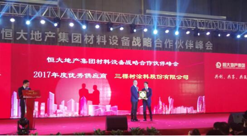 1月4日-5日,由恒大地产集团举办的2017年恒大地产集团材料设备战略合作伙伴峰会在深圳市南山区希尔顿酒店举行。会上对2017年作出重要贡献的恒大战略合作企业进行表彰,三棵树获评“2017年度优秀供应商”荣誉称号,这也是三棵树连续第八年获此殊荣, 三棵树董事副总裁林德殿先生受邀出席活动并领奖。