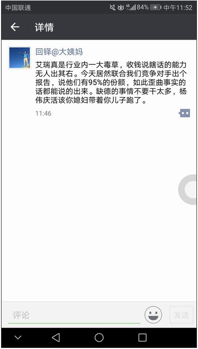 易特网 讯:2017年1月4日上午,大姨妈公关负责人回铎在微信朋友圈发信息,指出艾瑞数据造假,并对艾瑞的创始人进行了语言上的人身攻击。圈内人士透露,回铎在媒体群里解释,广告客户不认可大姨妈,称其只有5%市场份额,因此被激怒。