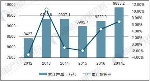 2005年以来,我国家用冰箱行业整体上保持快速发展,据前瞻产业研究院发布的《冰箱行业市场需求预测与投资战略规划分析报告》数据显示,产量从2005年的3105.58万台增长至2016年的9238.30万台,年复合增长率为9.51%,预计2017年中国电冰箱累计产量将达9883.2万台,同比增长约6.9%。