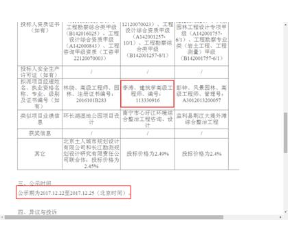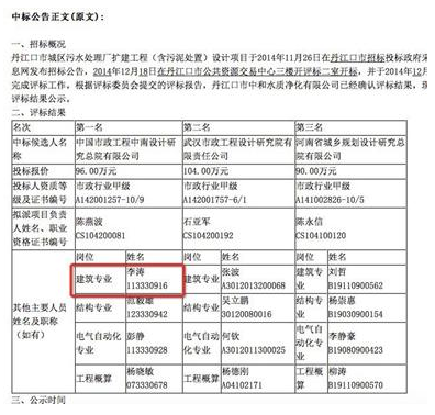 根据举报人提供的线索本单位也在2014-12-19公示的【湖北省】丹江口市城区污水处理厂扩建工程(含污泥处置),中国市政工程中南设计研究总院有限公司以及拟派主要工作人员名单中,李涛的名字以中标候选人方式出现,这次李涛在编号113330916的证书中显示的是高级建筑学。