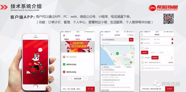 多元化下单系统:帮啦跑腿智能化系统,支持多种下单途径(电话、微信公众号、微信小程序、手机APP、手机Web端、电脑PC端),借助移动互联网和软件技术打 造的智能化同城快送服务平台。实时掌握订单、资金、配送分布区域、订单动态等。