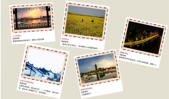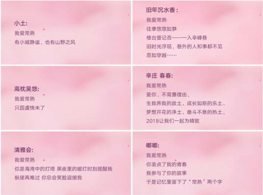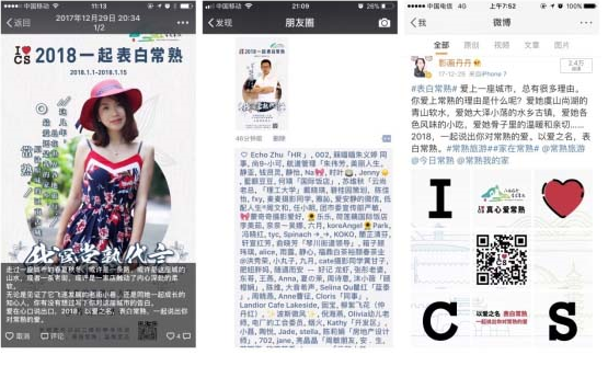 常熟旅游形象大使:若有所思、墨者攻在守,知名达人影画丹丹等几位常熟各行业的代表,他们在自己的朋友圈以表白常熟“代言人”的身份纷纷向常熟告白,他们嘴角扬起的自豪的微笑,让常熟每一个市民连接起共同的城市情感纽带。