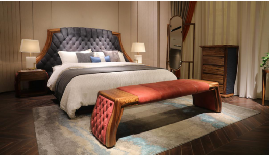 卧室家具,则沿袭了客厅的风格,稳重的床头靠背,和床头柜相呼应,在色彩上,蓝与红交相辉映,卧室的椅子、餐台与整体相得益彰。