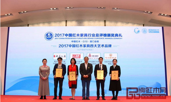 在颁奖礼上,品牌大会组委会授予泰和园“2017中国红木家具四大艺术品牌”的颁奖词是:“它是时代的弄潮儿,以追求极致美设计理念,屡创翎檀力作登国内外大展,获至高荣耀。升华品牌旅程,绽放出耀眼的光芒,它惊艳业界。”