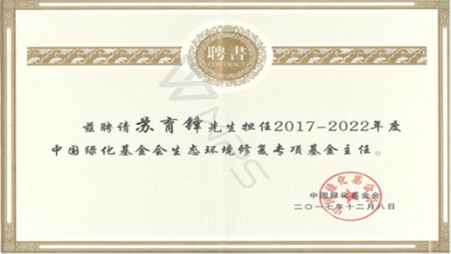 中国绿化基金会生态环境修复专项基金主要用于“一带一路”沿线生态环境修复工程、造林绿化、生态治理改造、大气治理、土地综合治理、生态文明宣传、生态环境类论坛沙龙等相关公益活动。现由健坤国际航空有限公司董事长苏育锋先生担任2017-2022年度中国绿化基金会生态环境修复专项基金主任。