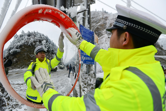 春节期间,返乡人多,道路上容易出现交通拥堵,为避免交通事故的发生,保障交通安全,全国各大城市的交通管理部门会抽调警务人员,在城市道路中执勤巡逻,以便处理紧急情况。他们,在风雪中擦拭着道路广角镜,让拥堵的街头变的秩序井然。