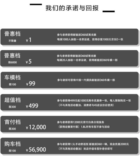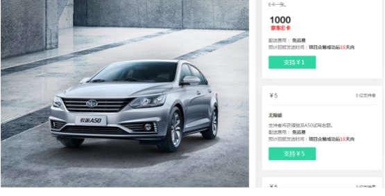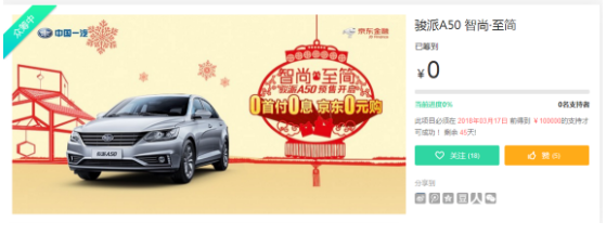 2018年1月31日,天津一汽全新A级家轿——骏派A50在京东线上首发预售,并且联合京东金融开启了“0首付+0利率”白条购车活动。预售期间,消费者可登陆京东众筹界面参与多档活动,其中“首付档”可获得12000元首付白条分期服务并享受12期免息优惠,真正实现线上新车“0元购”。