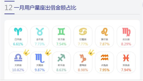 从星座分布来看,1月出借星座冠军为颇有鉴赏力的天秤座,拥有敏锐直觉的天蝎座、思维缜密的摩羯座位列3甲。天秤星座的人充分展现出“谋定而后动”的理性倾向,他们的出借通常要经过仔细的市场调研分析和反复的推敲思考。