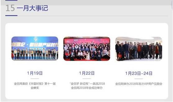 平台进行充分的信息披露是行业良性发展的重要一步。运营报告还展示金信网1月的品牌大事记:金信网喜获《华夏时报》第十一届金蝉奖;“金信梦 新征程”—赢战2018金信网2018年年会成功举办;金信网举办2018年首次VIP用户见面会 , 企业VIP用户代表莅临金信网,深入了解金信网合规发展与未来规划等相关大事记内容,在展示工作印迹的同时,也呈现给客户一个平台稳健蓬勃发展的企业形象。