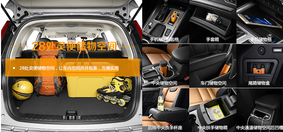 得益于SUV车型本身的空间优势,远景SUV后备箱的高度和深度表现都不错。远景SUV后排座椅支持4/6等比倒放倒,放倒后较为平整,最大可以获得1735L的储物空间,装载大件物品也很轻松,此外远景SUV车内还提供了28处灵便储物空间。后备箱下沿的高度设计的偏低,方便用户装载那拿取物品。尾门开启后的高度适中,即使是瘦小的女士,关闭尾门也是比较方便的。