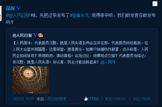 @人民日报3月2日19:27发布评论【人民微评:代表委员沉默,就是人民失语】两会召开在即,代表委员纷纷抵京。在人民大会堂共商国是,这是荣誉,更是责任。如果只知道热烈鼓掌、点头称是,人民民主如何体现?质询政府,请动真格;会场讨论,何惧观点交锋?代表委员当铭记:你沉默,就是人民失语;你认真,民主才能运转起来!