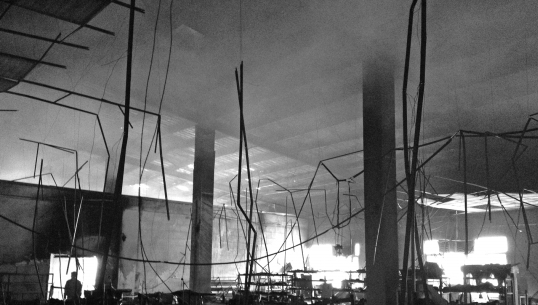 目击者邓先生说,到了中午12时10分许,可以看到明火不停往二楼的窗户外冒,消防车赶到现场后没多久就控制了火势,到中午13时许,明火基本看不到,只剩下黑烟往外冒。走进二楼的区域,生产车间头顶的天花被全部烧塌下来,存放货物的仓库被烧得只剩下铁架。